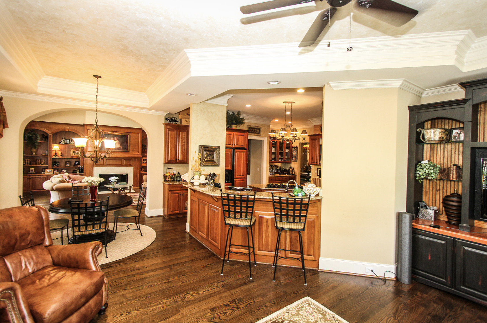 Our first mission was to drop the bar counter down to counter height. Second, we changed out the cherry, brown, and orange tones for a neutral palette of cool browns and warm grays. We demo’d the desk area and switched it out for a wet bar, and updated all the lighting, fixtures, and hardware to contemporary selections.
