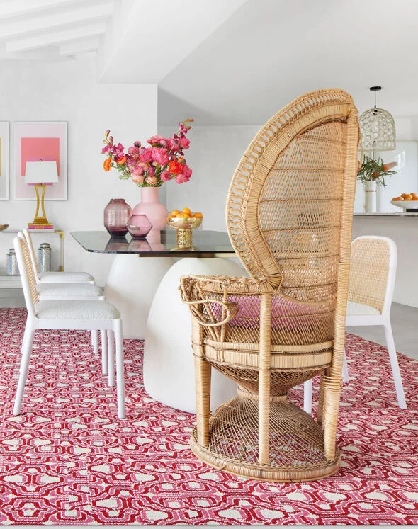 There are two more patterns including this pink in their California Dreaming pattern. It would look great in a teen’s room where it can stand up to some abuse as well as in a fun and feminine dining area as shown.